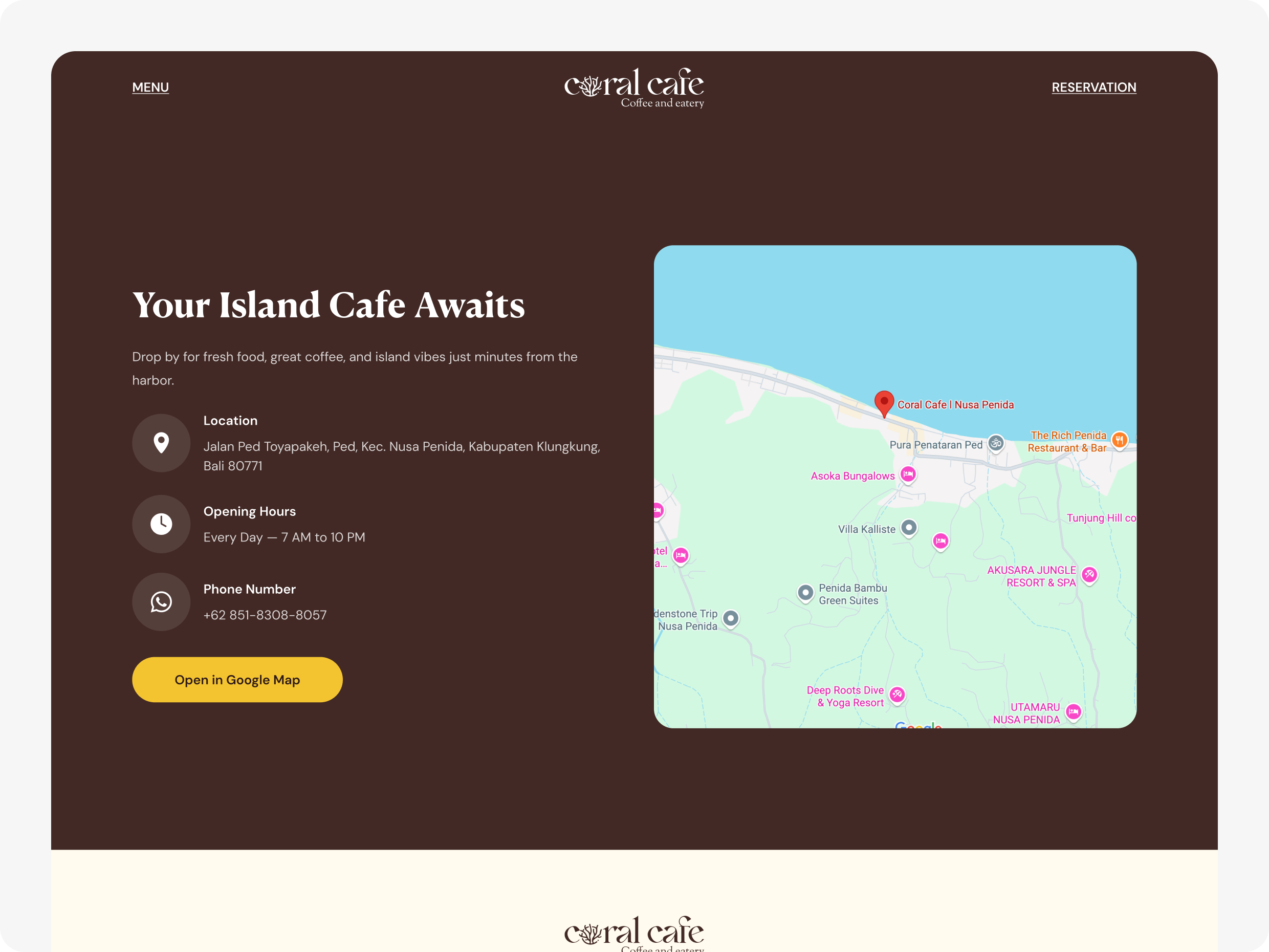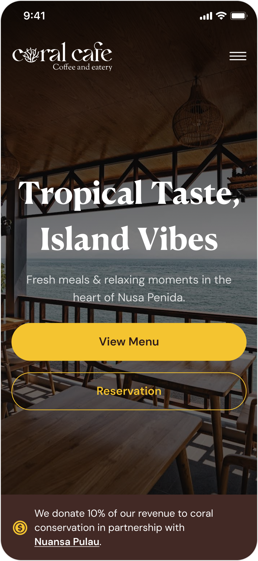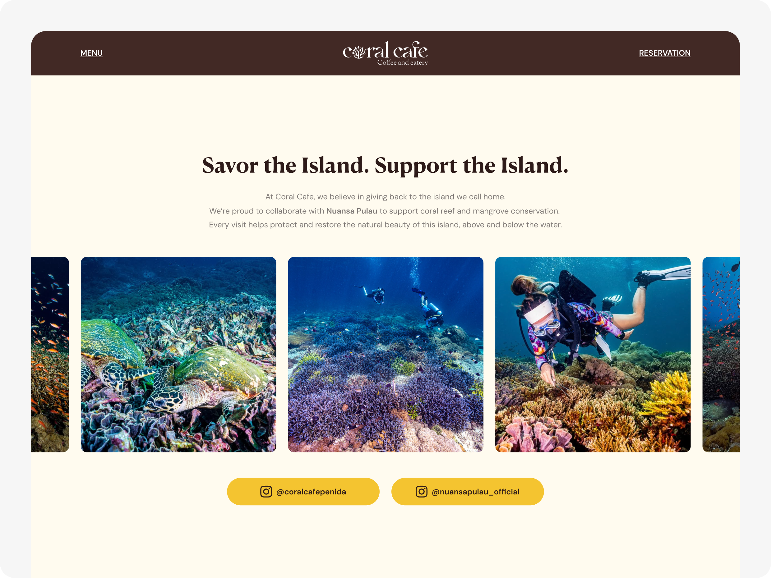 Website ini berfungsi sebagai media utama untuk menampilkan menu, fasilitas, dan informasi terbaru dari Coral Cafe. Dengan platform online ini, kafe dapat menjangkau lebih banyak pelanggan, meningkatkan citra profesional, dan semakin dekat dengan komunitas lokal maupun wisatawan. Selain itu, website ini membantu membangun citra kafe yang ramah, otentik, dan dekat dengan komunitas lokal maupun wisatawan.