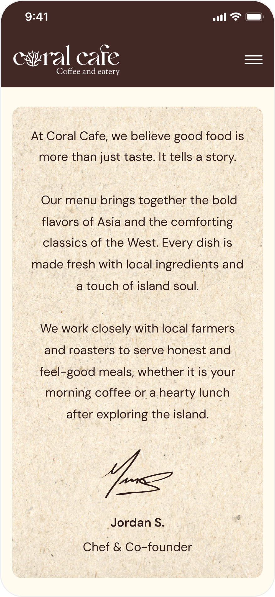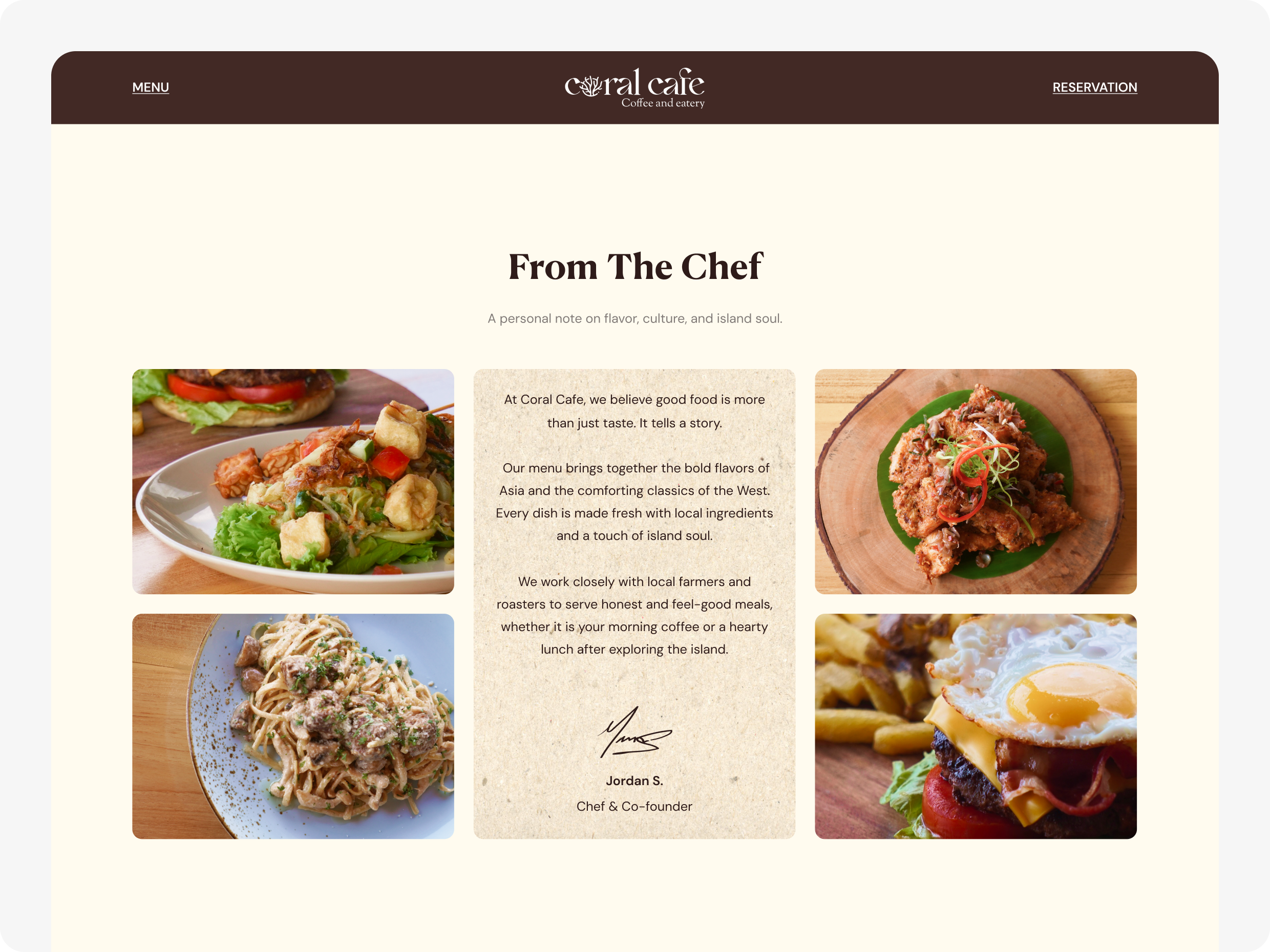 Setiap elemen visual dibuat sederhana namun elegan, mulai dari warna natural hingga galeri foto yang hidup. Desain ini bertujuan mencerminkan karakter kafe yang ramah dan terbuka, sekaligus memberikan pengalaman browsing yang menyenangkan bagi pengunjung.