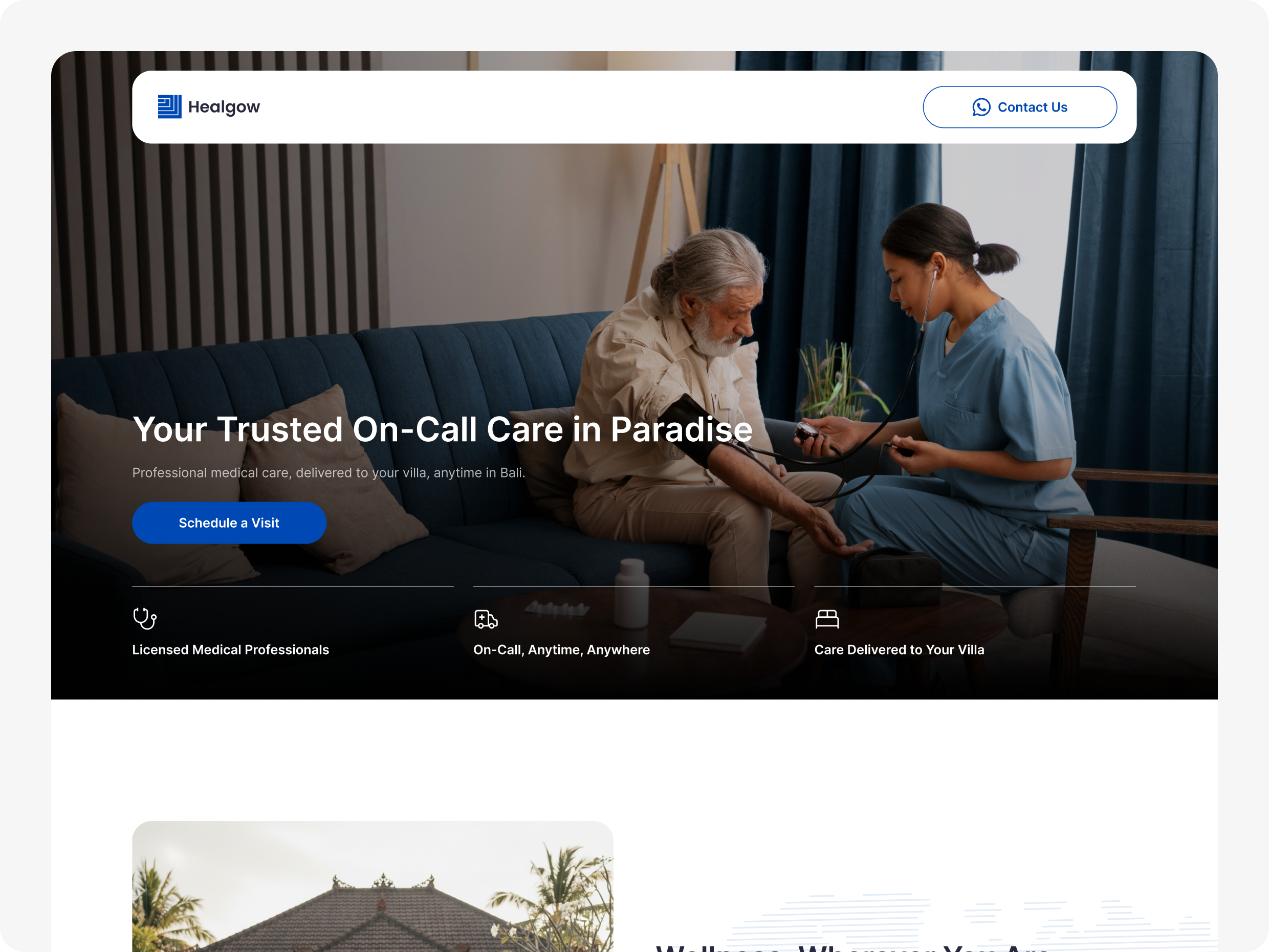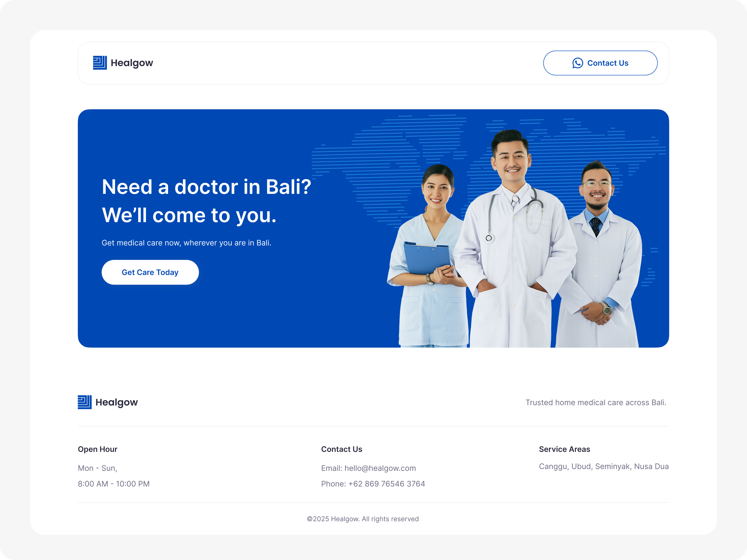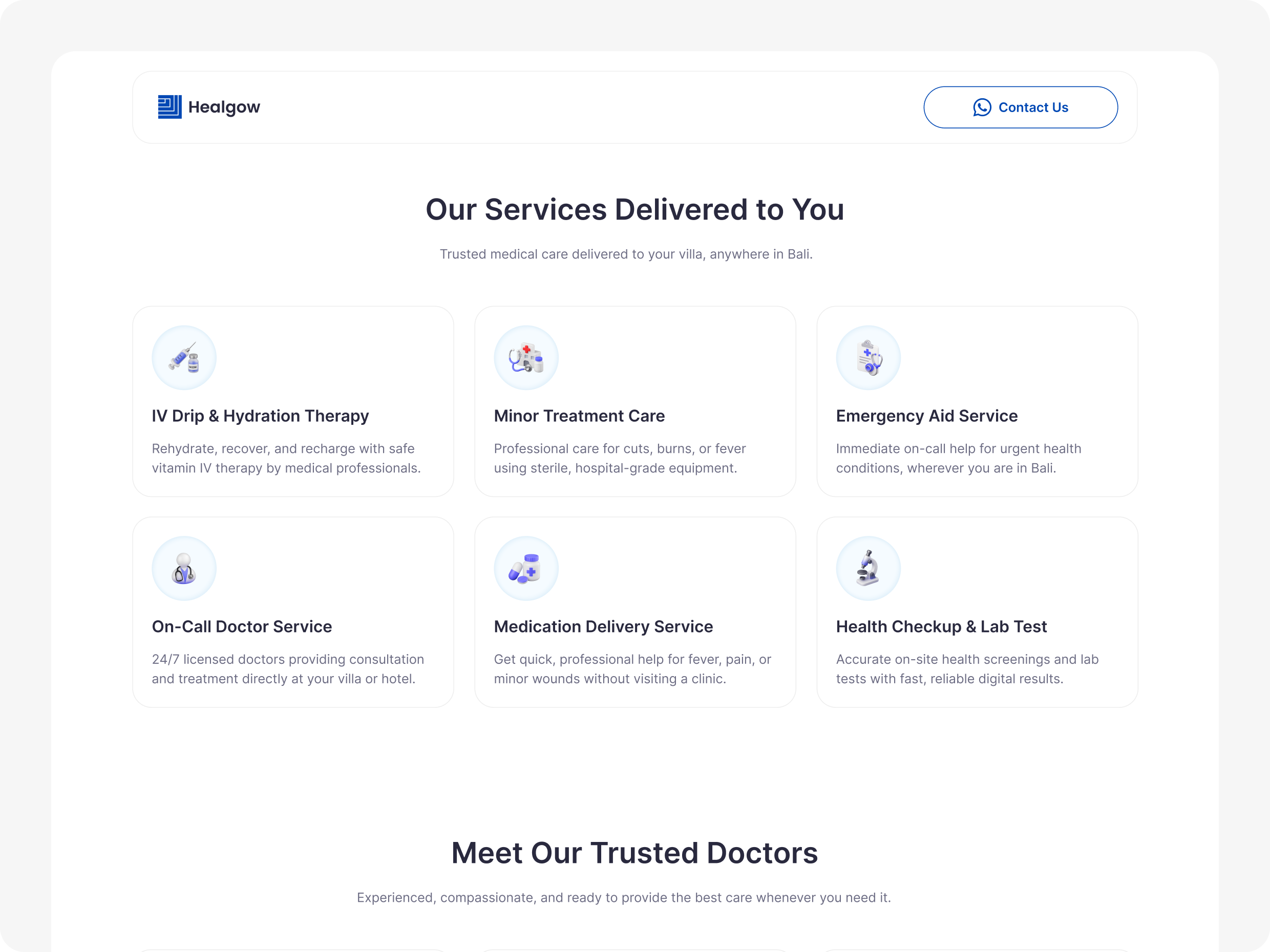 Website ini dibuat menjadi titik awal bagi pasien untuk memahami layanan medis yang tersedia, melihat profil tenaga kesehatan, hingga menjadwalkan kunjungan dengan cepat. Dengan tampilan yang bersih dan pendekatan komunikasi yang human–centered, platform ini membantu memperkuat posisi Healgow sebagai penyedia layanan medis panggilan yang mengutamakan kenyamanan, keamanan, dan kualitas.