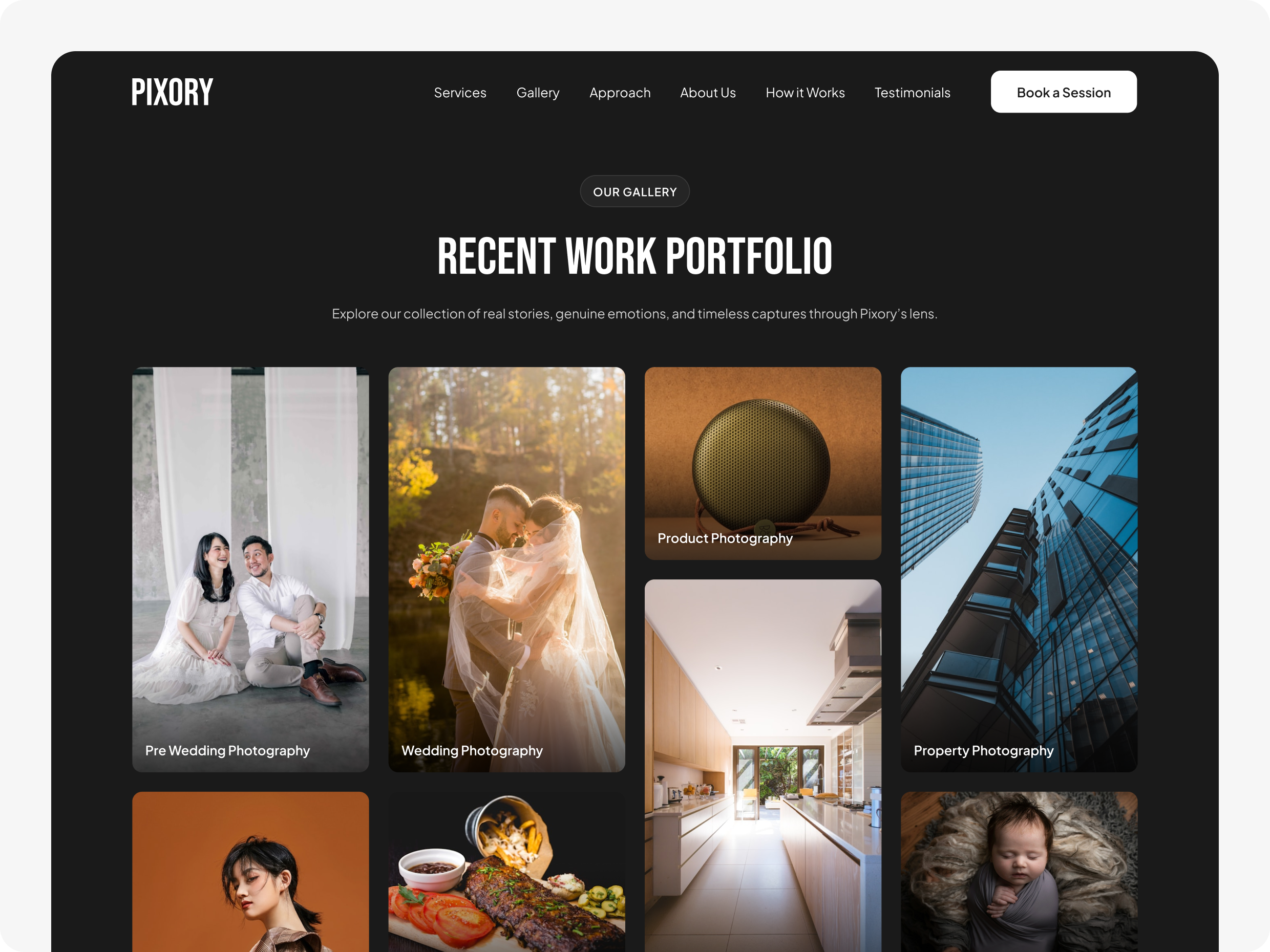 Website ini dirancang menjadi titik awal bagi klien untuk memahami gaya visual Pixory, melihat portofolio, hingga memesan sesi foto dengan praktis. Dengan pendekatan visual yang bersih dan narasi yang kuat, platform ini membantu memperkuat citra Pixory sebagai penyedia jasa fotografi yang mengutamakan kualitas serta pengalaman klien di setiap momen spesial.