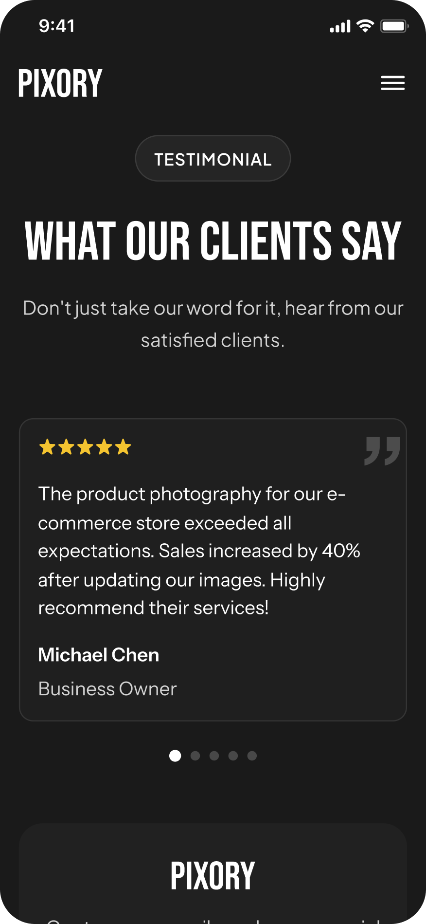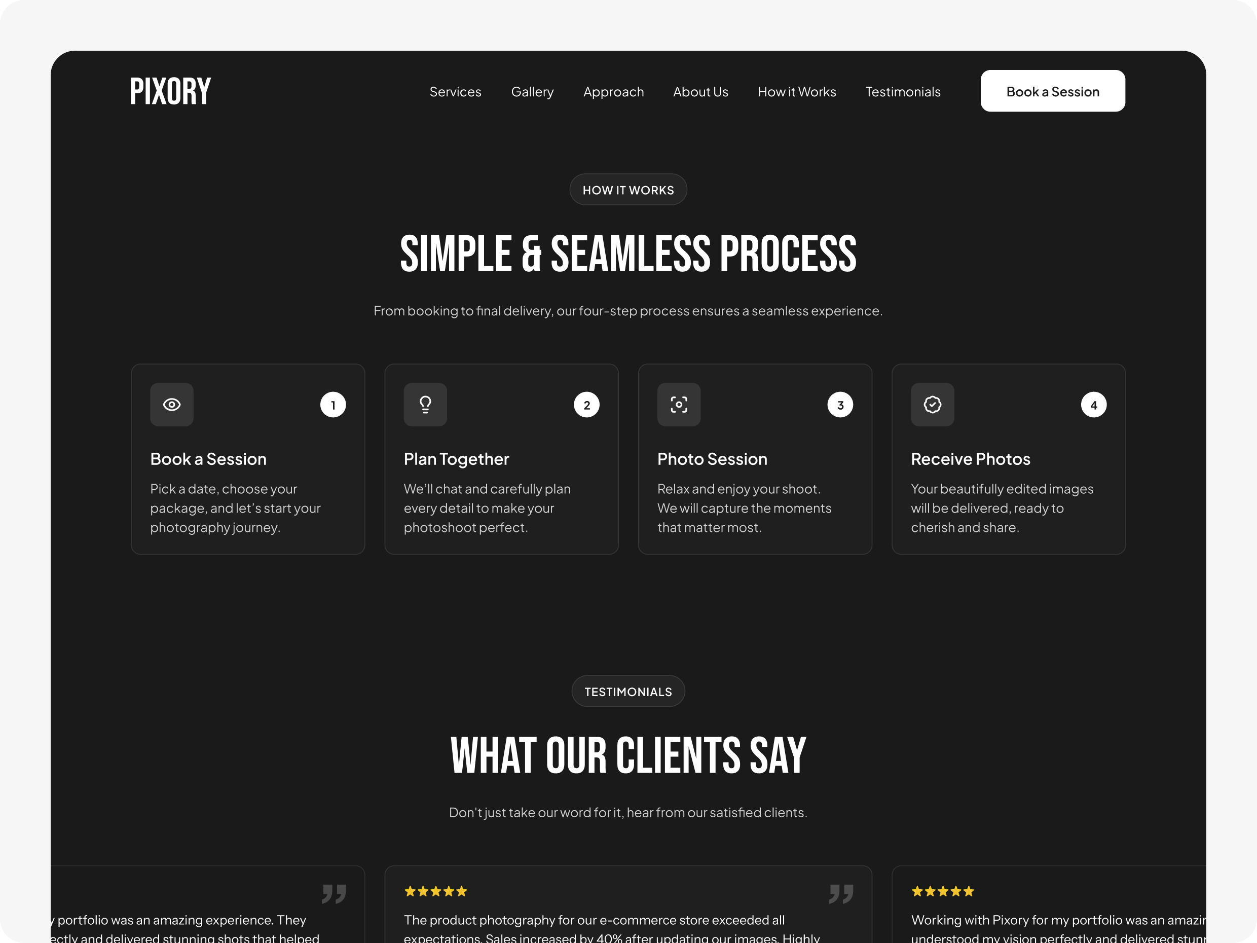 Warna netral dan layout minimalis dipilih untuk menonjolkan hasil foto sebagai fokus utama. Setiap elemen disusun rapi untuk menciptakan alur yang nyaman, mulai dari galeri, informasi layanan, hingga testimoni. Struktur yang sederhana namun elegan ini memperkuat profesionalitas Pixory dan membantu klien menjelajahi informasi dengan mudah di berbagai perangkat.