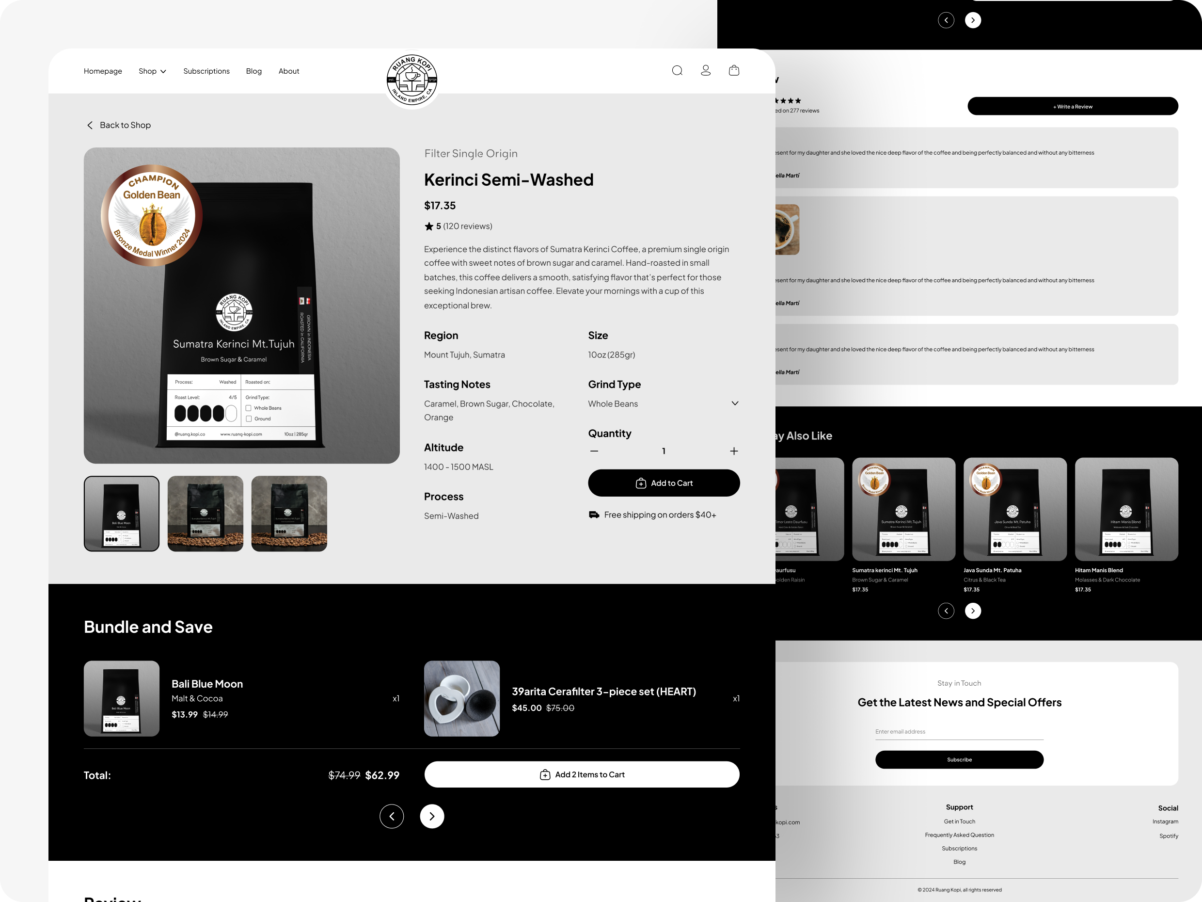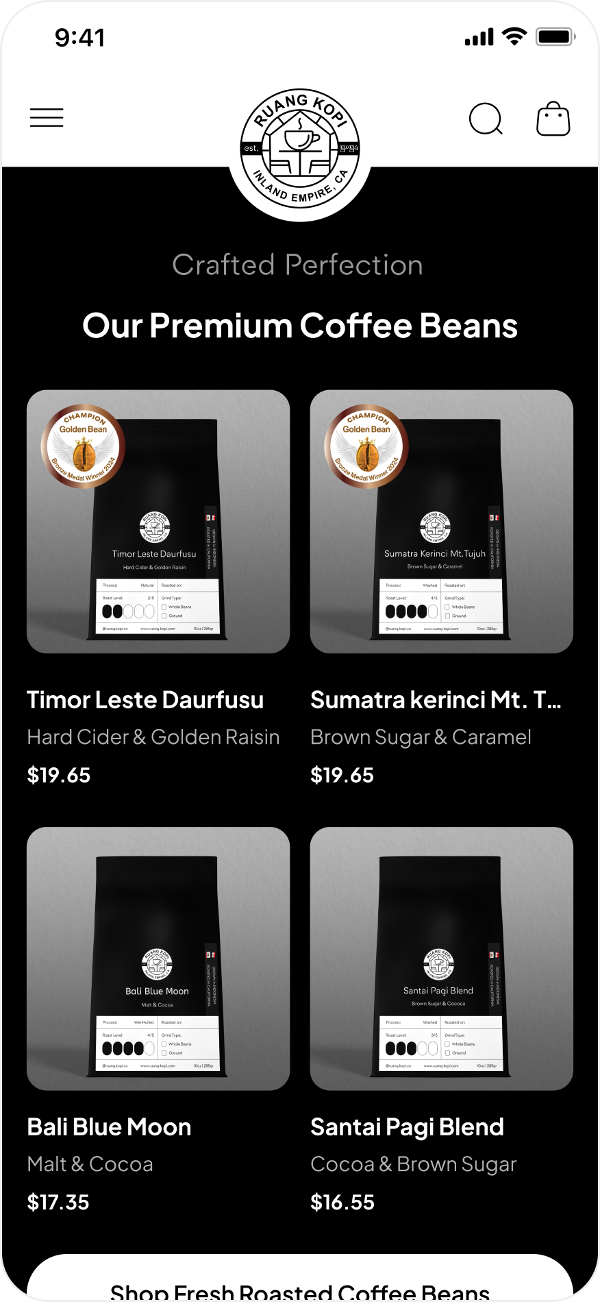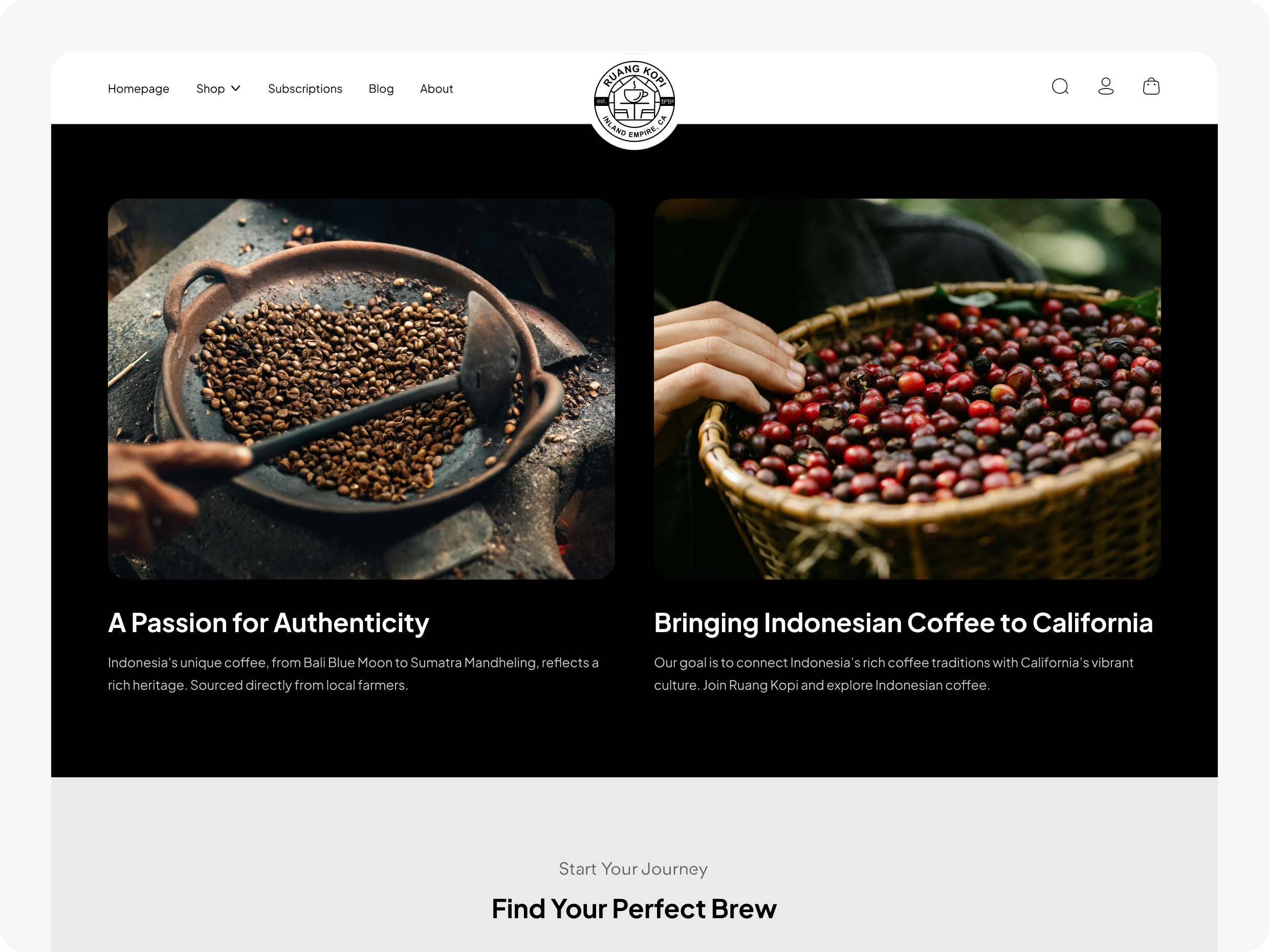 Desain dibuat minimalis dengan dominasi warna hitam dan putih yang memberi kesan eksklusif, sekaligus menonjolkan produk kopi sebagai fokus utama. Elemen visual seperti galeri produk, cerita brand, hingga testimoni pelanggan ditata rapi untuk membangun kepercayaan, menciptakan pengalaman belanja online yang nyaman, dan mendukung positioning Ruang Kopi di pasar global.
