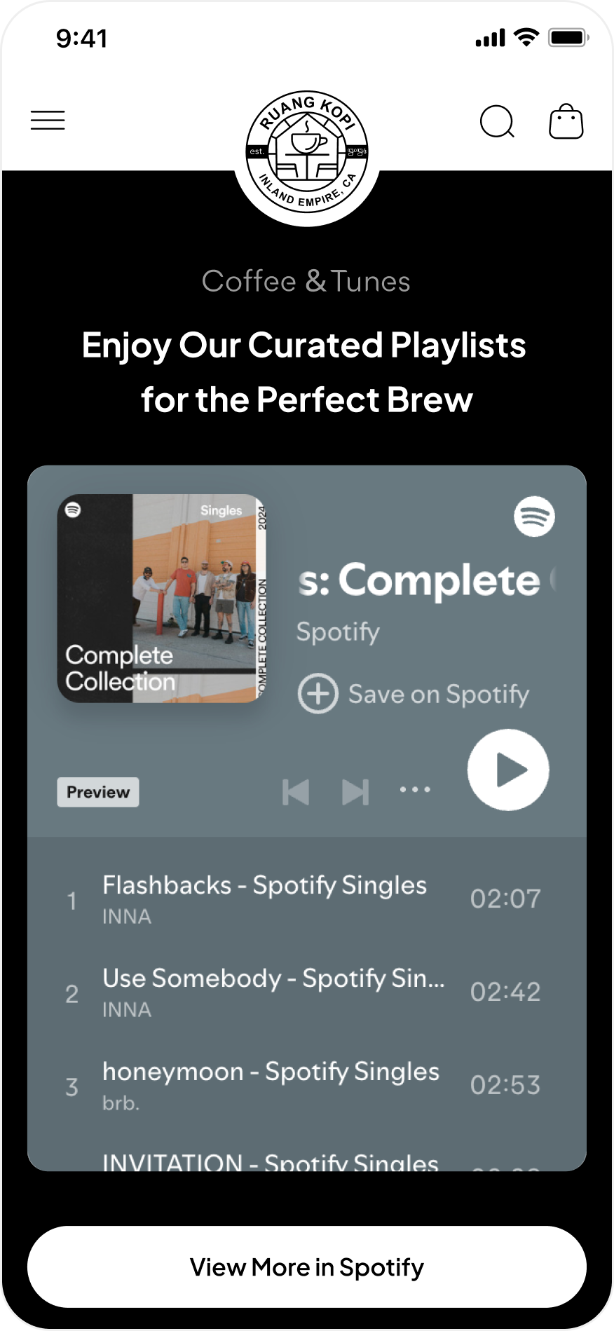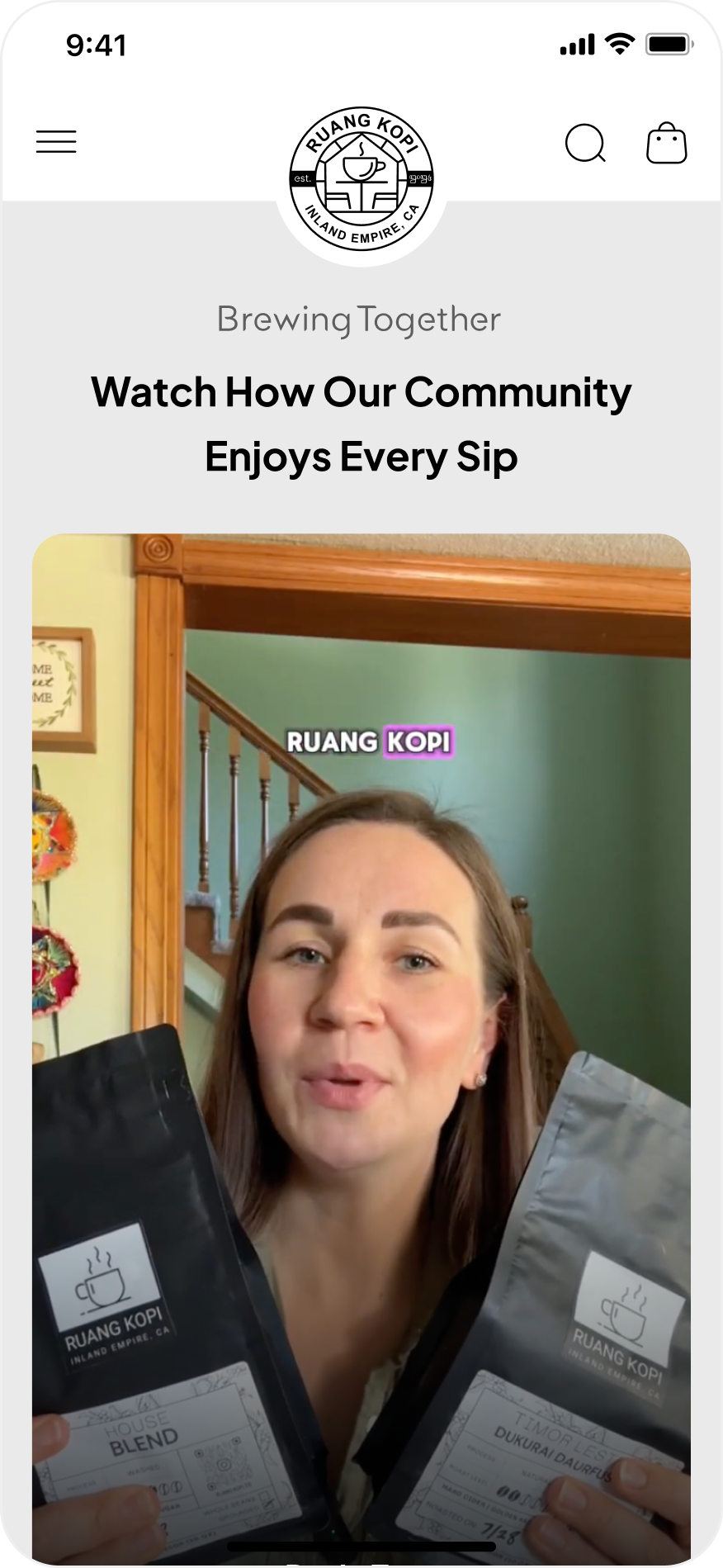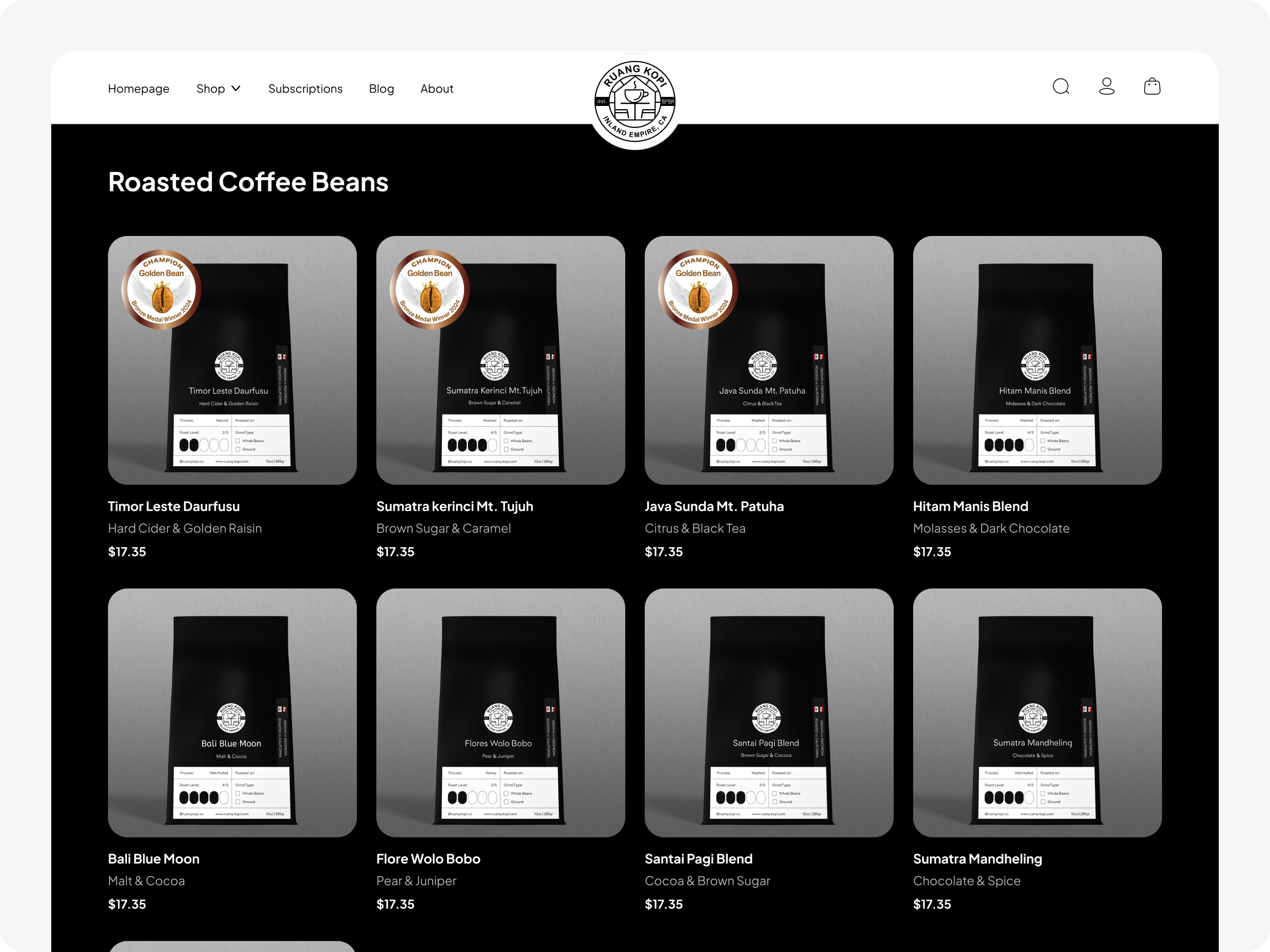 Desain dibuat minimalis dengan dominasi warna hitam dan putih yang memberi kesan eksklusif, sekaligus menonjolkan produk kopi sebagai fokus utama. Elemen visual seperti galeri produk, cerita brand, hingga testimoni pelanggan ditata rapi untuk membangun kepercayaan, menciptakan pengalaman belanja online yang nyaman, dan mendukung positioning Ruang Kopi di pasar global.