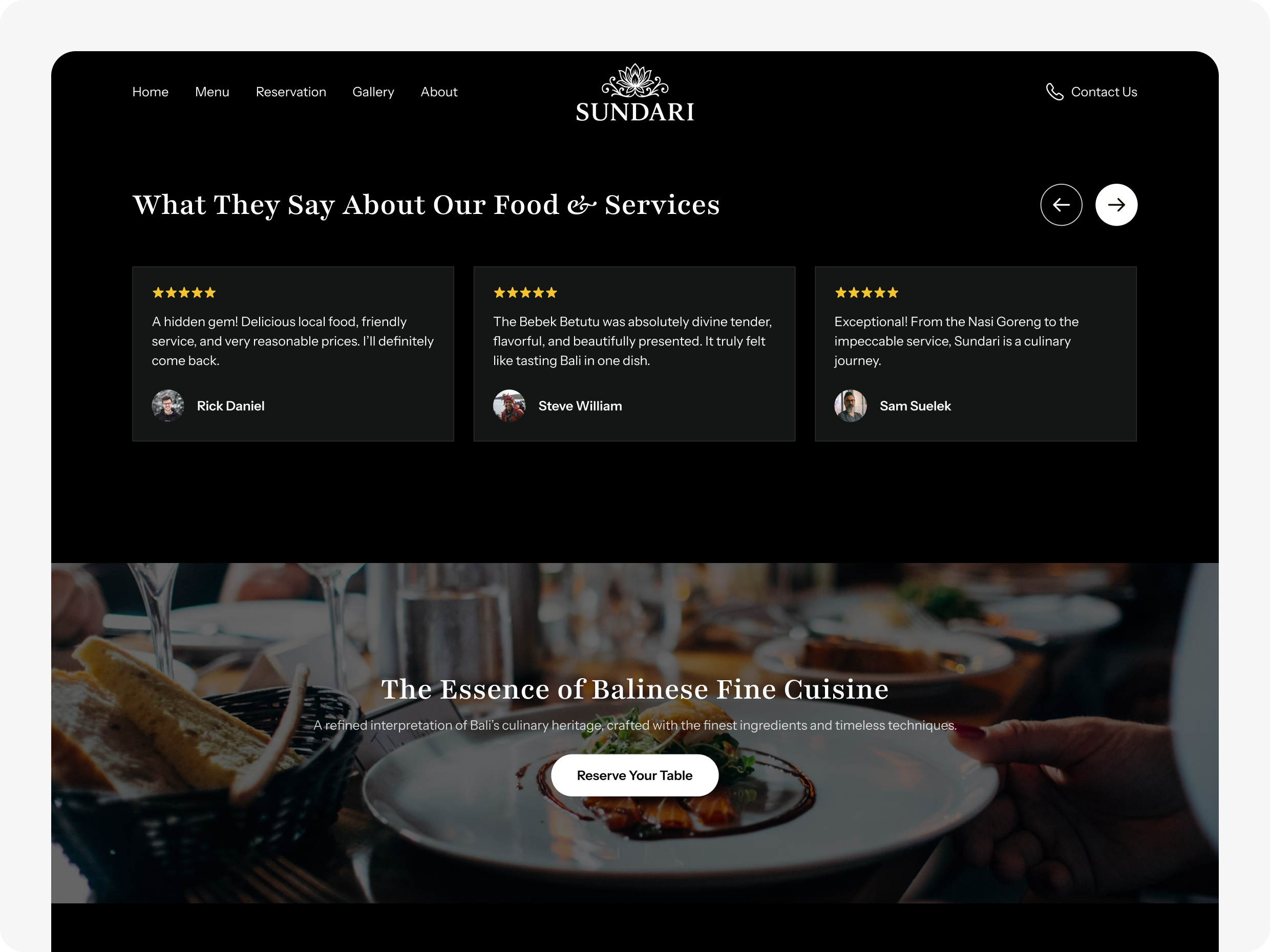 Warna gelap dan aksen keemasan menciptakan rasa eksklusif dan sophisticated, sementara komposisi visual fokus pada ambience restoran serta kualitas pelayanan. Struktur konten dibuat simpel dan intuitif sehingga pengguna dapat menjelajahi informasi dengan nyaman, memperkuat kesan profesional dan kohesi brand Sundari di mata tamu lokal maupun internasional.